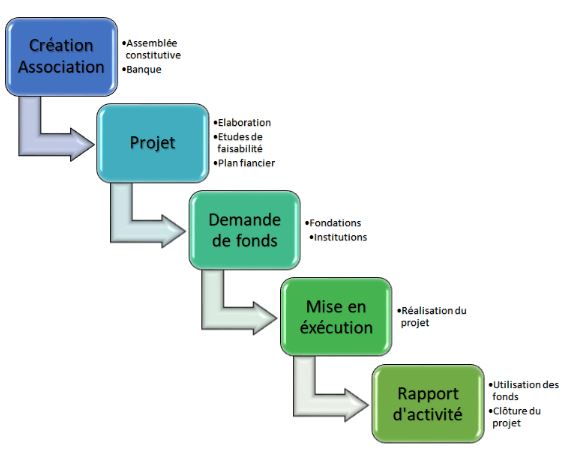Création -> Etude des projets -> Demandede fonds -> Mise en exécution -> Rapport d'activités